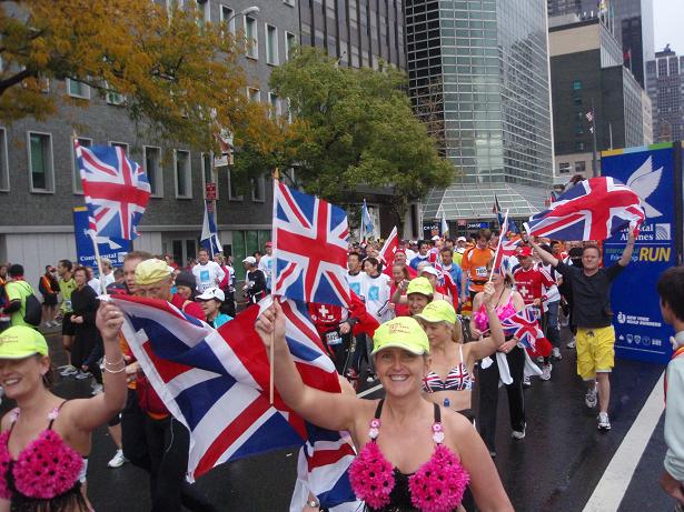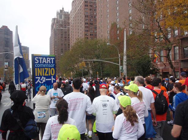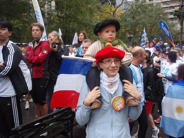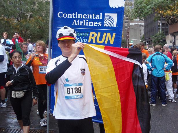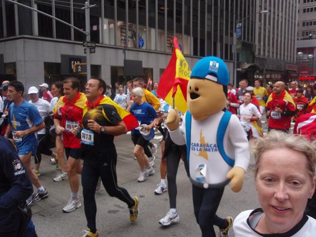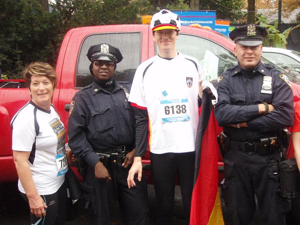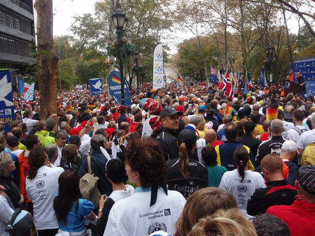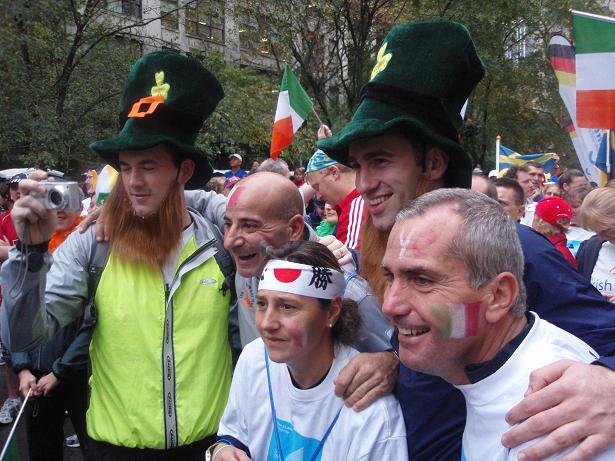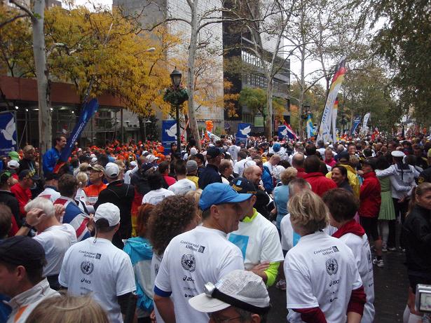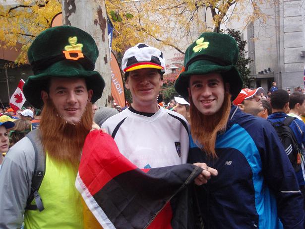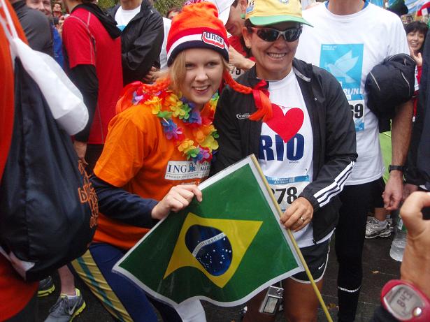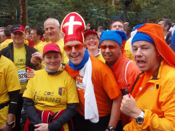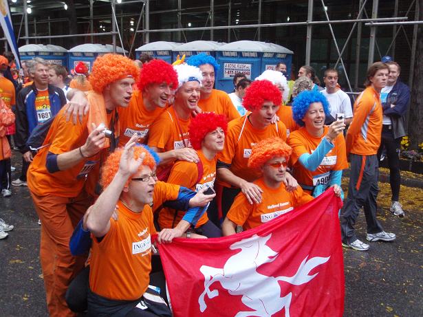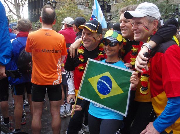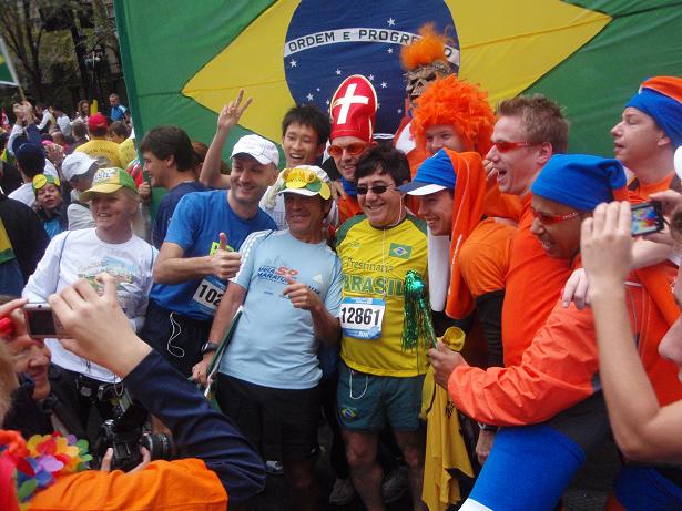 Beste Stimmung schon vor dem Start. Rein zahlen- mäßig waren die Holländer (1602 gemeldete Läufer beim New York Marathon) hinter den Italienern (3460), Franzosen (3170), Briten (2613) und Deutschen (2482) zwar nur die fünft- größte nichtamerikanische Ländergruppe, die fielen aber am meisten auf. Und dazu die Brasilianer. |