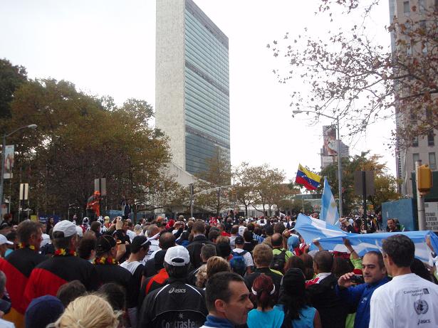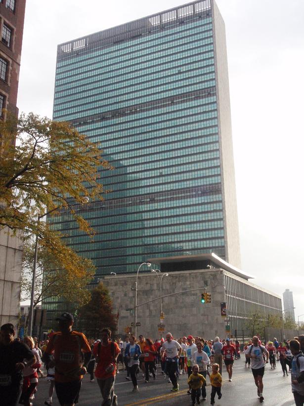 Kurz nach neun Uhr setzte sich das Feld langsam in Richtung First Avenue in Bewegung. Hier zu sehen das Hauptgebäude der Vereinten Nationen, vor dessen Toren der Start des Laufes ist. |