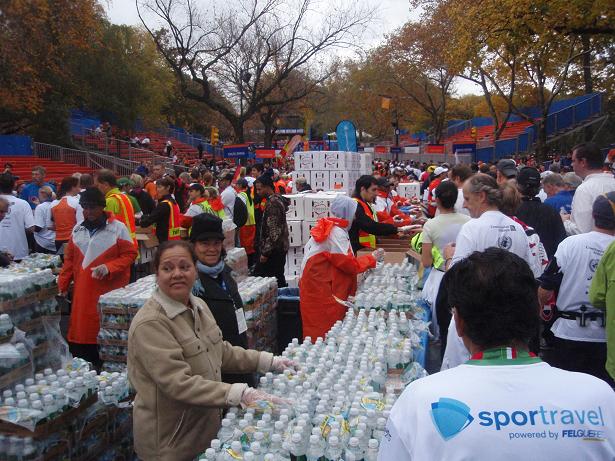Kurz vor dem Marathonziel gab es Frühstück. Polish Spring Water und Bagels (allerdings ohne Butter). |