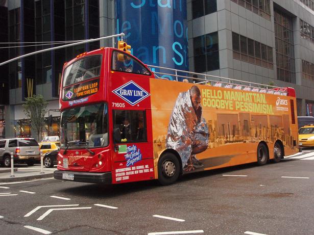 Einer der vielen Busse mit Marathon-Werbung von Sponsor ASICS. |