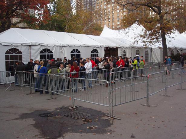 Um 7 Uhr öffnet im Tavern- on-the-Green der Monday Marathon Store. Hier kann man seine Medaille gravie- ren lassen und Finisher- Artikel kaufen. Es handelt sich hierbei ausschließlich um Sachen, die man sonst nicht kaufen kann. Und wie man sieht ist es um 7.22 Uhr schon recht voll. |