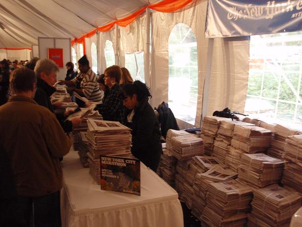 Sehr beliebt die Montags- Ausgabe der New York Times mit einer dicken Beilage zum Marathon mit Namen und Zeiten aller Finisher, die es unter 4:45 Stunden ins Ziel geschafft haben. Kleiner Wermuts- tropfen: das sind beim New York Marathon nur knapp die Hälfte aller Finisher. Aber die Zeitung verkaufte sich auch so sehr gut. |