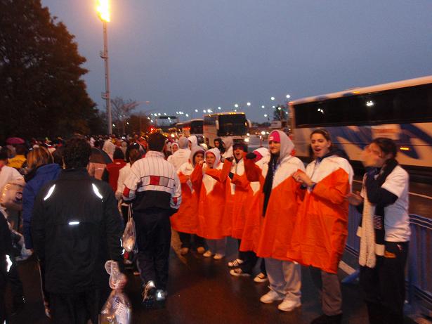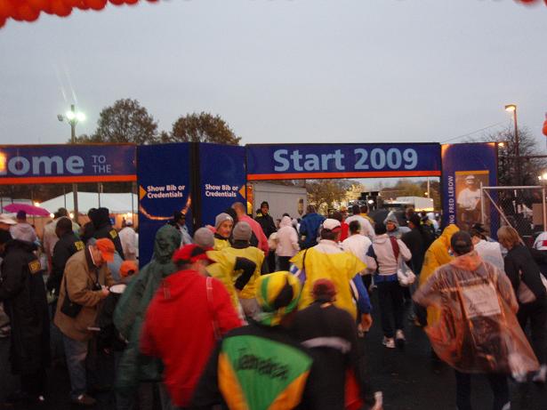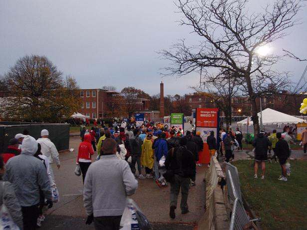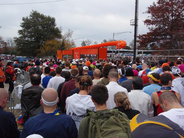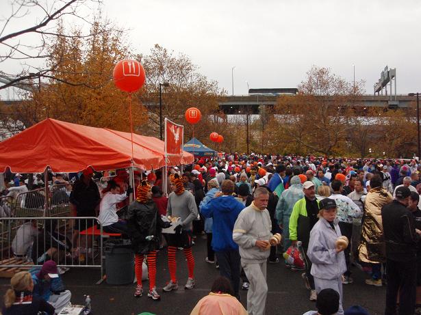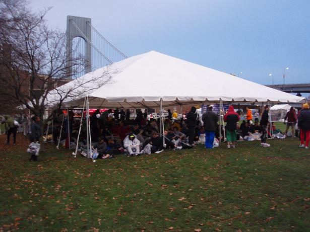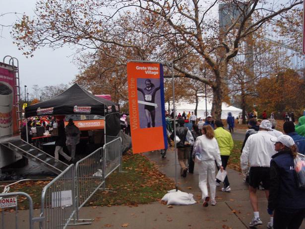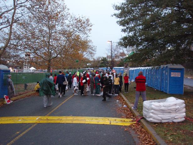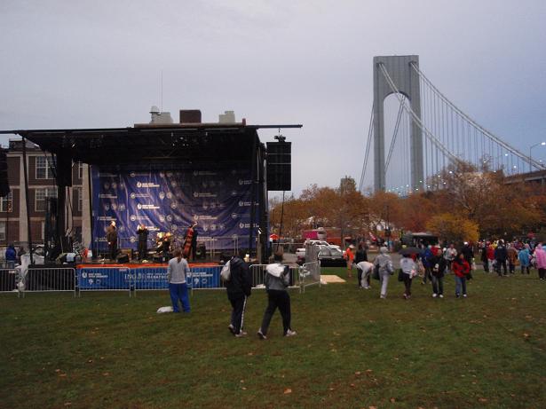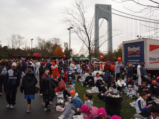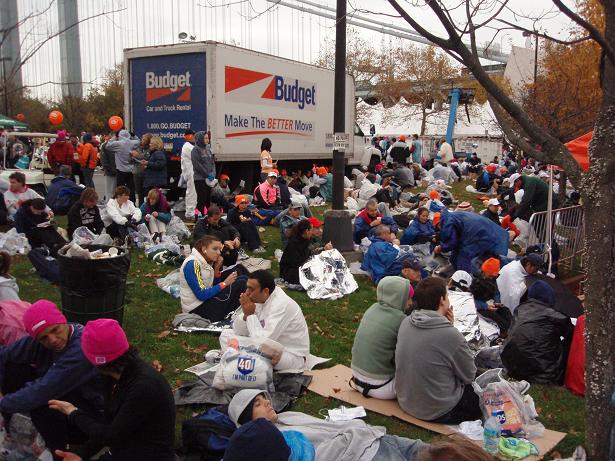 Fort Wadsworth, Staten Island, 6.22 Uhr Am Eingang zum Läufer- Dorf wieder eine Kontrolle. Aber das kannte ich ja nun schon. Als wenn wirklich einer eine Bombe mit zum Marathon nehmen würde, wo man sich problemlos und kostenlos überall an die Strecke stellen konnte. |