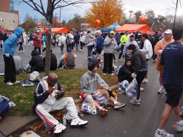 Zeit hatte man ja genug. Nur was damit anfangen? Und so setzte man sich an die Straße und plauderte mit Laufkollegen aus aller Welt. |