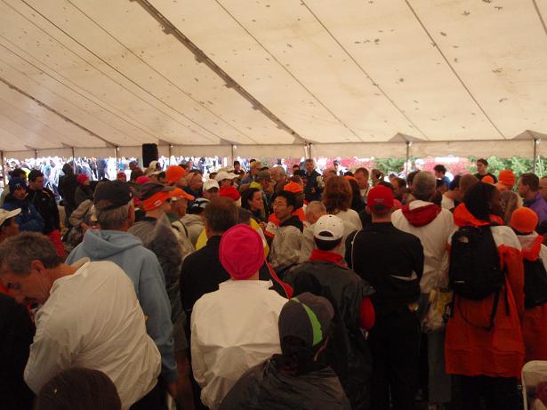 Endlich im Startbereich (8.35 Uhr) wurde wieder gewartet, diesmal mit Gottesdienst mit Predigern verschiedener Glaubens- richtungen. |