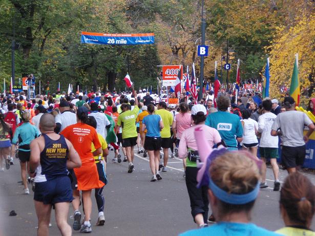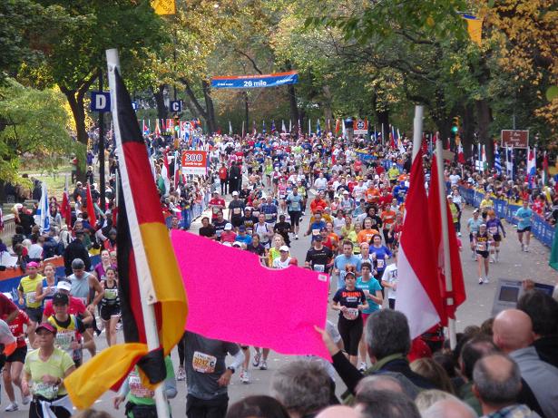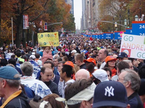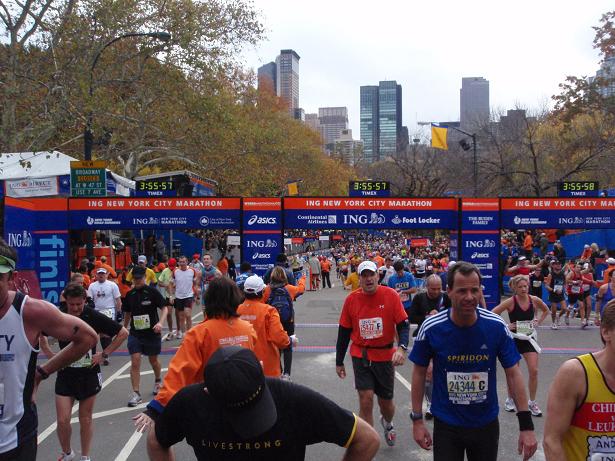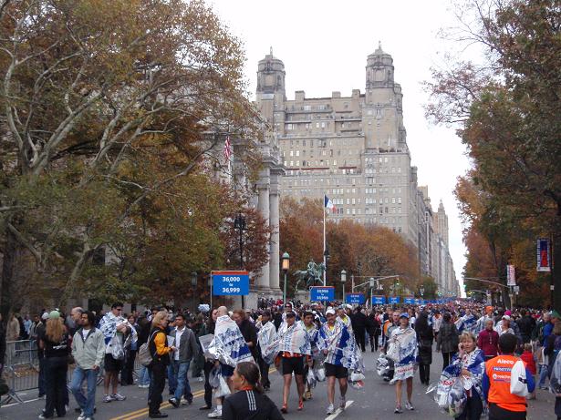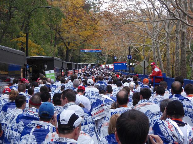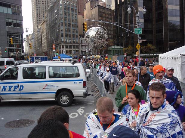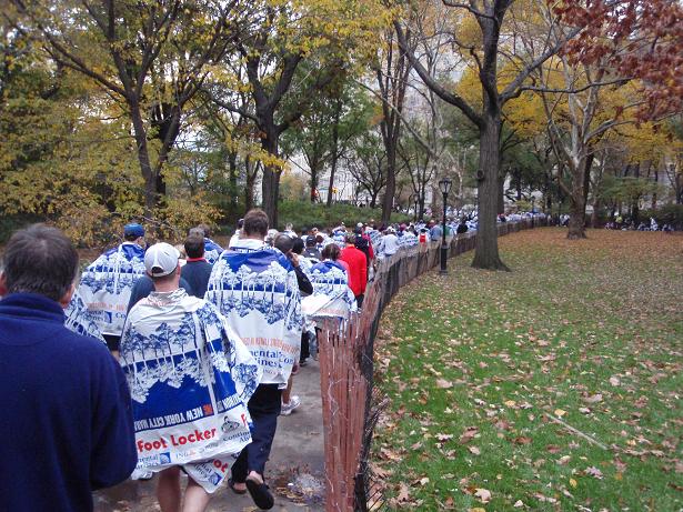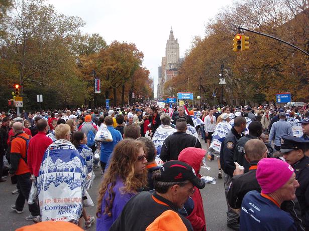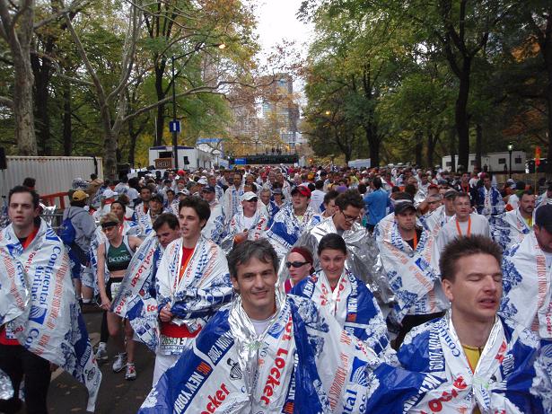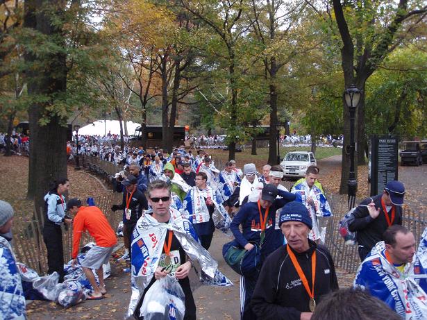 Der Weg an den Wagen mit den Kleiderbeuteln zog sich endlos hin. Schon hier lange bevor die Masse der Finisher kam (die kommt in New York bei 4:30 bis 5:00 Stunden) war der Weg hoffnungslos verstopft. Schrittchen für Schrittchen schlich man voran. Wem bisher die Beine nicht weh getan hatten, bekam das Gefühl jetzt nachgeliefert. |