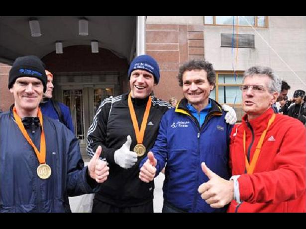 Nach 68 Minuten hatte ich die InterAir-Sammelstelle erreicht. 68 Minuten !!! Zu dem Zeitpunkt bin ich nach dem Hamburg-Marathon eigentlich schon geduscht zu Hause im Bett. Aber in New York ist halt alles ein wenig größer. Auch die Nach-Lauf-Quälereien. Links bin ich, 2. von rechts ist Lauf-Meister Herbert Steffny. Foto von: InterAir |