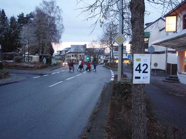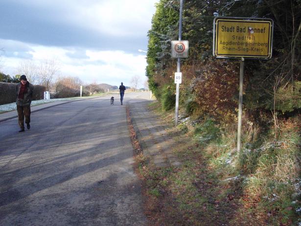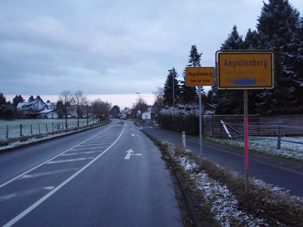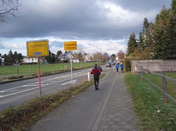 Dezember 2009, 8.17 Uhr Aegidienberger Straße Am Vortag hatte es noch geschneit und bei um die 0°C waren die Wege frei, aber sonst blieb Schnee liegen. Der Marathon findet in Aegidienberg statt. Dies ist ein Stadtteil von Bad Honnef (liegt etwas südlich von Bonn am Rhein). Das namensge- bende Siebengebirge liegt zwischen Bad Honnef und Aegidienberg. |