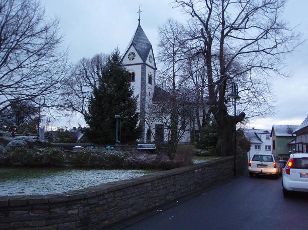 Hier der Marktplatz mit der Kirche. Bad Honnef ist die kaufkraft- stärkste Stadt Nordrhein- Westphalens. Das erklärt dann wohl auch die zwei Ortsschilder auf dem ersten Foto. Der Bahnhof hat allerdings weder Heizung noch Klo noch Gepäckauf- bewahrung. Und im Hotel ist es auch kalt. Naja, das Geld muß ja irgendwo herkommen. |