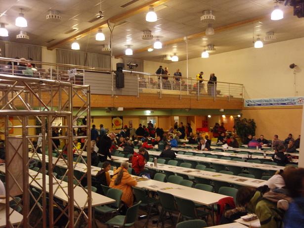 Aegidienberg, 9.03 Uhr Der Blick von der Empore in den Raum. Vor der Bühne gab es Startnummern. In der Halle konnte man auch ein Frühstück kaufen. Sah sehr lecker aus, kam mir aber zu spät. Ich hatte Verspätung auf der Anreise und nahm mein Frühstück von der Tankstelle. |