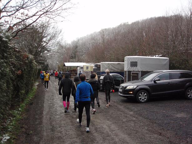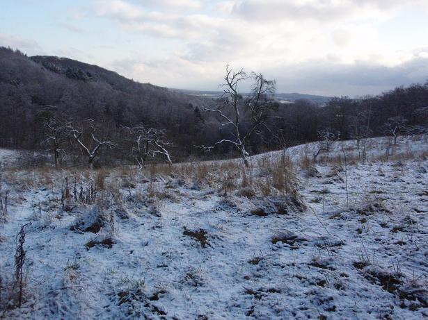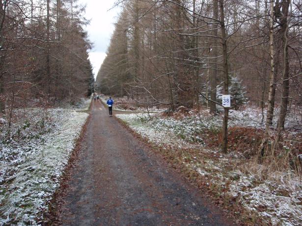 von der Merkenshöhe Kilometer 16,5 / 11.35 Uhr Entgegen meiner Befürch- tung einer Rutschpartie konnte man auch runter ziemlich sicher laufen, wenn man aufmerksam den Boden beobachtete. |