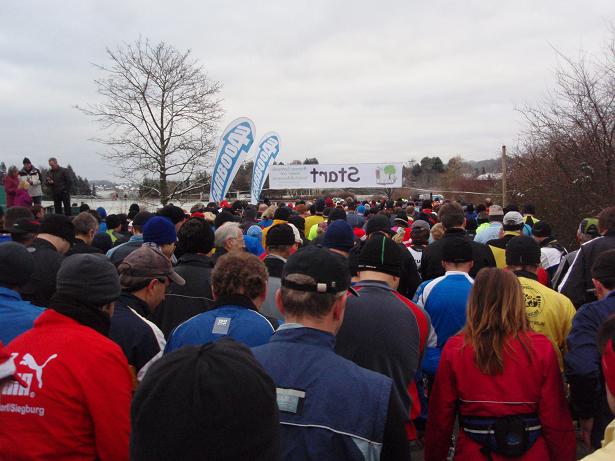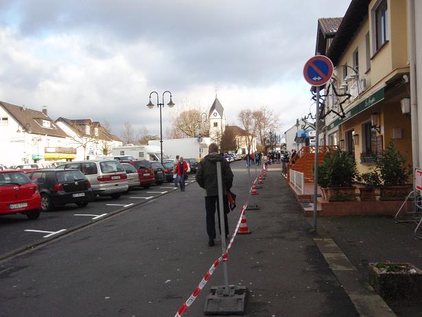 Peter-Staffel-Straße, 9.42 Uhr Der Start liegt ungefähr 700 Meter vom Bürgerhaus entfernt und ist völlig unpro- blematisch zu finden. Zum Einen ist der Weg idioten- sicher ausgeschildert. Und zum Anderen wandert man einfach der Masse hinterher. |