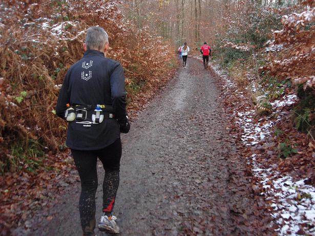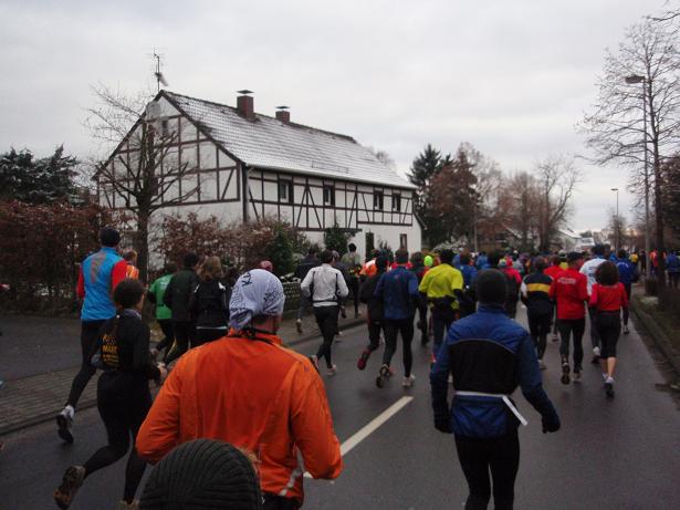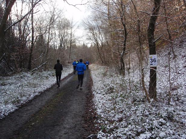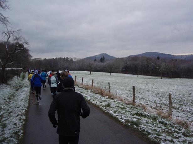 Siebengebirge Kilometer 31,5 / 13.05 Uhr Zum inzwischen dritten Mal ging mir der Schnürsenkel auf. Bei 40 Marathons hatte ich das Problem insgesamt (!!) nur zweimal. Schwierig wurde die Sache, weil ich inzwischen halb erfrorene Finger hatte (trotz Hand- schuhe) und damit nun die Schnürsenkel nur leidlich wieder zumachen konnte. |