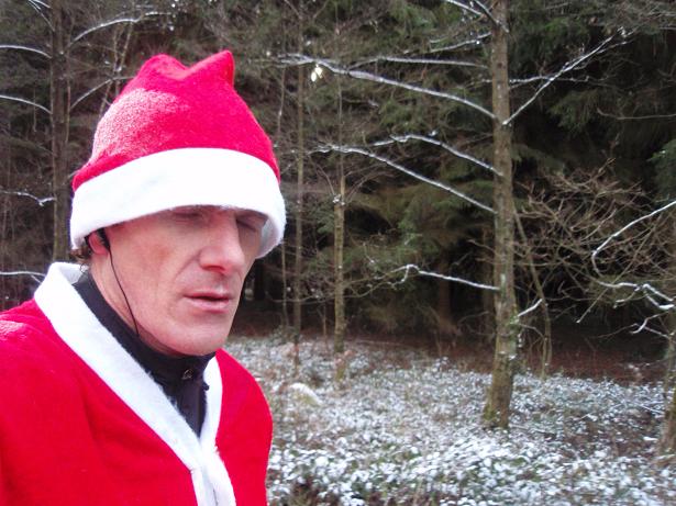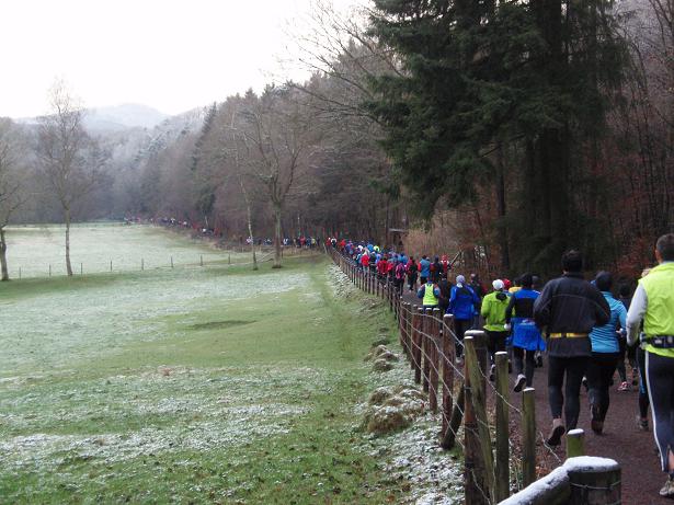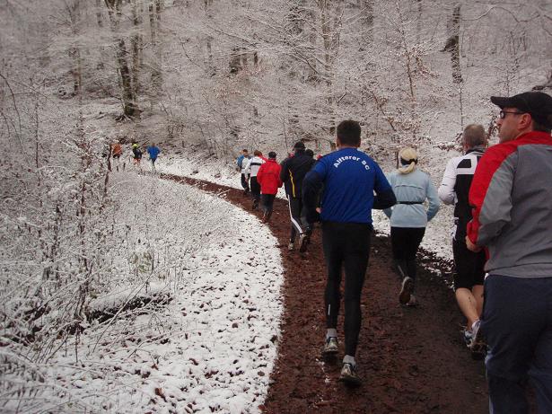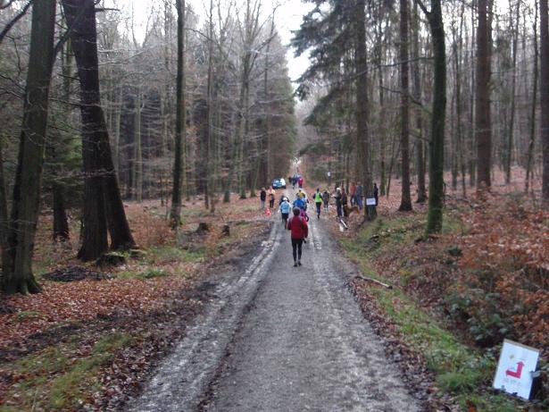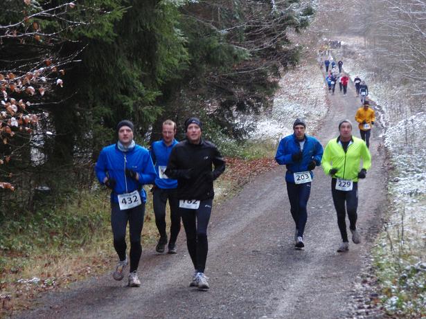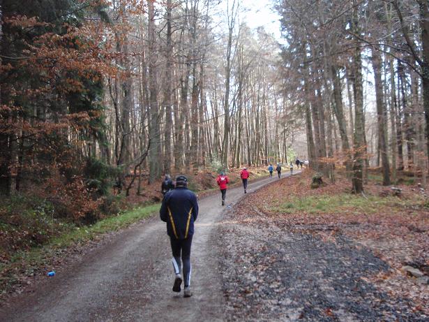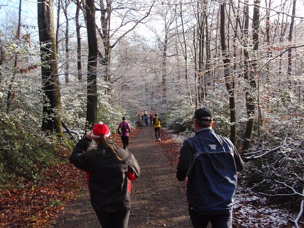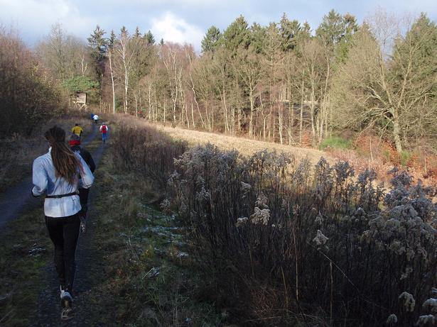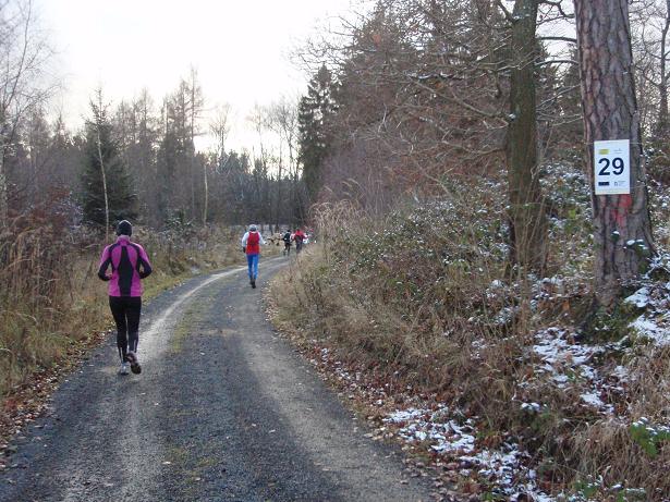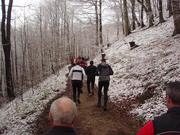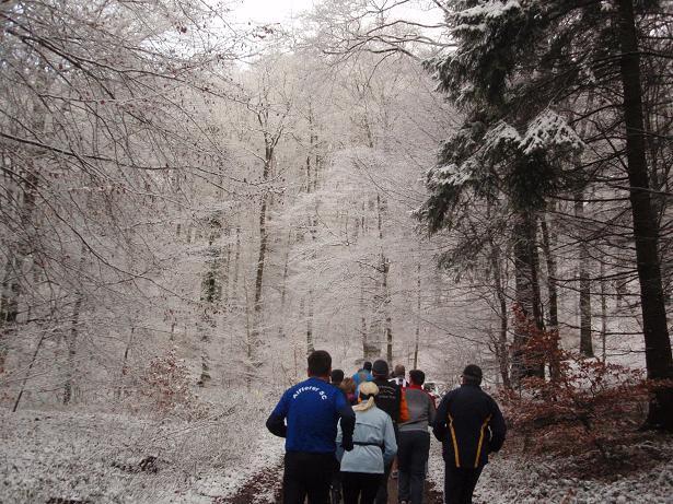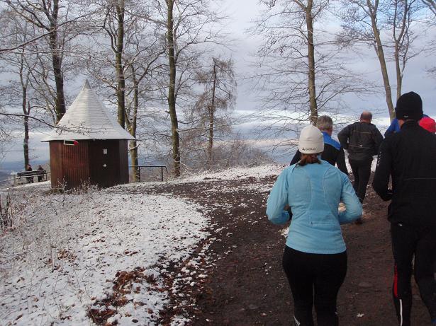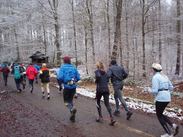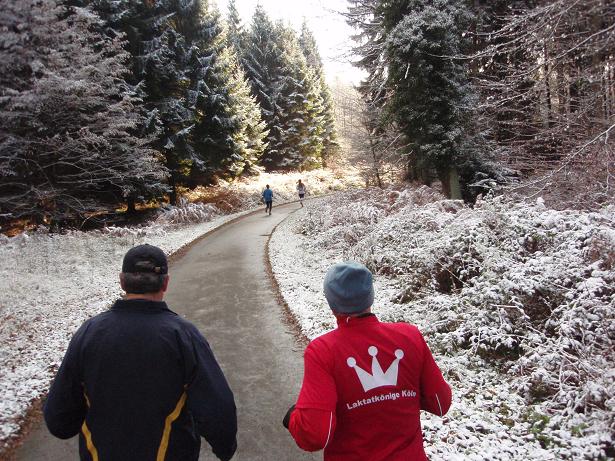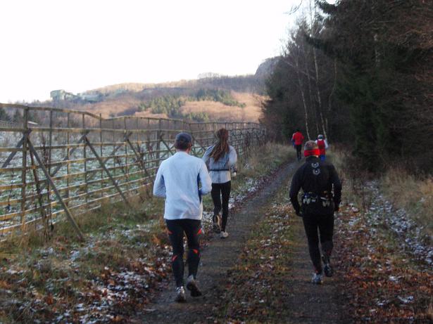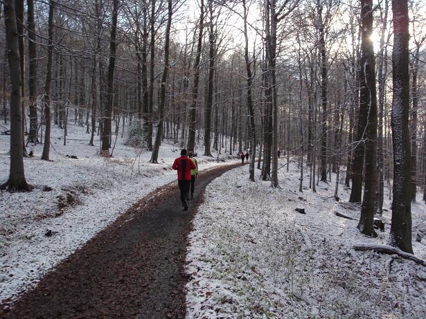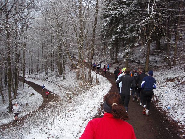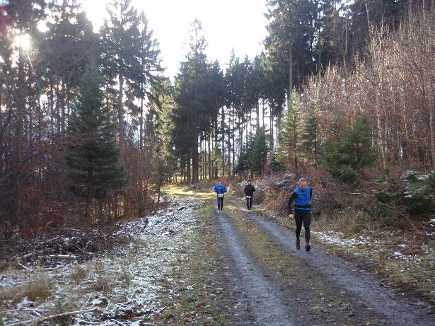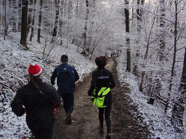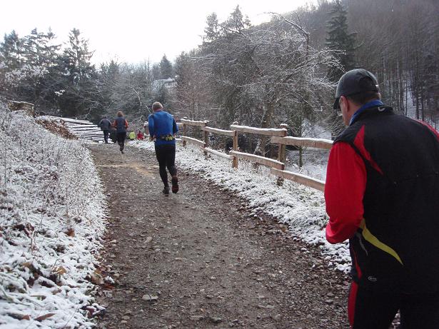 von der Merkenshöhe Kilometer 15,5 / 11.31 Uhr Nun ging es knapp drei Kilo- meter den Weg zurück, den wir von Kilometer 5,5 bis 8,5 raufgelaufen waren. Rasend schnell folgte ich dieser Gruppe um die Nikolaus- Mütze. Diese ziemlich hohe Tempo sollte sich später noch rächen. Ich bin eben kein geübter Bergläufer. Weder rauf noch runter. |