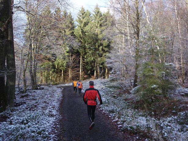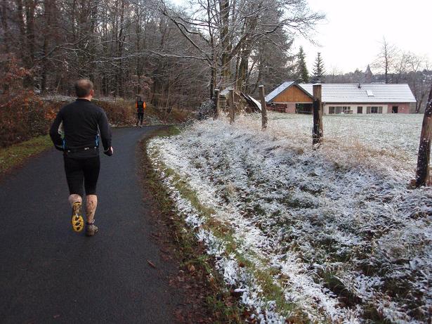 Richtung Merkenshöhe Kilometer 7,5 / 10.46 Uhr Nun kam der erste richtige Anstieg, der über drei Kilo- meter auf fast 400 Meter gehen sollte. Auch wenn es auf den Fotos vielleicht so aussieht, der Boden war nicht gefroren. |