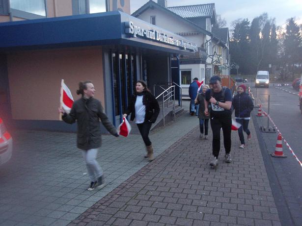 / Bei Kalenborn Kilometer 36 / 13.37 Uhr Diese munteren Gesellen nahmen die Steigung im Laufschritt. Ich konnte nicht mehr. Mit waren die Finger eingefroren und der Rest wurde auch kälter und kälter. Den Marathon aufgeben war natürlich keine Option. |