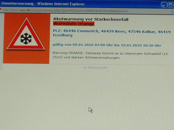 Internet Das war zu befürchten. Und mit "nur" starkem Schneefall waren wir noch gut dran. Den ganzen Samstag hatte es zum Schnee auch noch mächtig gestürmt. Erst zum Abend hin wurde es besser. Im Nord-Osten Deutsch- lands herrschte da schon Ausnahme- zustand. Ganze Orte und Landkreise waren von der Außenwelt abgeschnit- ten. Sturmtief "Daisy" hatte das Land fest im Griff. In Kevelaer war es da sehr harmlos. |