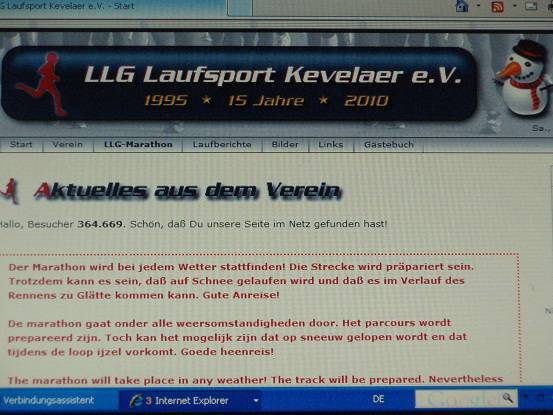 Internet Der Veranstalter reagierte promt und gab am Samstagmittag die Meldung raus, daß der Marathon "bei jedem Wetter" stattfinden würde. Das war auch notwendig. Denn die Zahl der besorgten Anrufer wuchs und wuchs. |