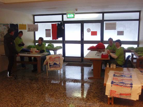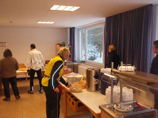 Jugendherberge Kevelaer 9.28 Uhr Draußen war es kalt. Kein Wunder also, daß man sich nach abgeholter Startnummer und dem Umziehen so lange es ging drinnen aufhielt. Über Nacht hatte der Wind nachgelassen und es war nur noch ein wenig Schnee gefallen. |