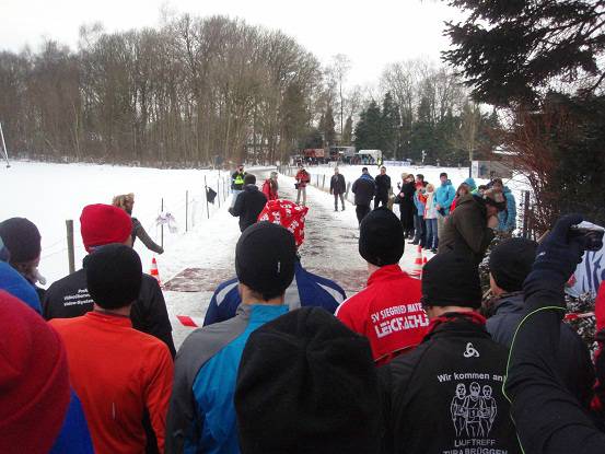 Am Michelsweg 9.59 Uhr Kurz vor dem Start rottete sich dann das Feld zusammen. 400 Läufer sind das Maximum. Nach und nach wurden aber noch ein paar Nachmeldungen akzeptiert, so daß sich am Ende gut 450 Läufer angemeldet hatten. Davon kamen aber nur gut 260 zum Start. Bei den Witterungsbedingungen auch kaum ein Wunder. Aber... war hatten die im Januar erwartet? |