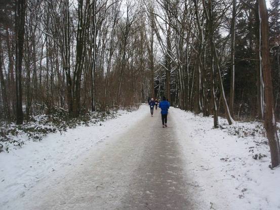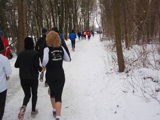 Wissener Weg 11.11 Uhr, Runde 3, Km 13,5 Nun kam der Schnee. Zusammen mit dem scharfen Wind wurde das Laufen jetzt unangenehm. Da hoffte man nur noch, schnell wieder in den etwas schützenden Wald zu kommen. Und selbst dann waren es noch vier weitere Runden. |