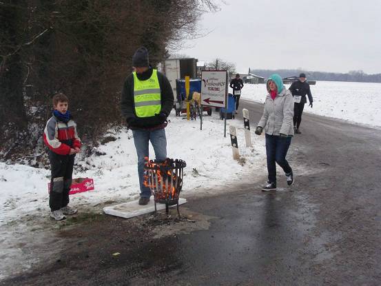 Michelsweg / Wisserner Weg, 10.24 Uhr, Runde 1, Km 4,7 Dort wo der Anfangspart und die lange Schleife aufeinander treffen, gab es auf beiden Seiten der Strecke einen Verpflegungsstand. Insgesamt kam man so 14-mal an einem Ver- pflegungsstand vorbei. Wasser und Tee waren warm, die Coca-Cola leider eiskalt. Dazu gab es Honigkuchen und Obst. |