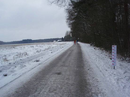 Hoher Weg 13.11 Uhr, Runde 6, Km 33,8 Bei Km 33 und 34 unternahm ich zwei Laufversuche und hörte nach kaum 100 Metern wieder auf. Es ging einfach nichts mehr. Ich kämpfte mich nur noch von Schritt zu Schritt. Was ein Glück, daß Wind und Schnee wie- der nachgelassen hatten. Vermutlich wäre ich sonst auf der Strecke einfach erfroren. |