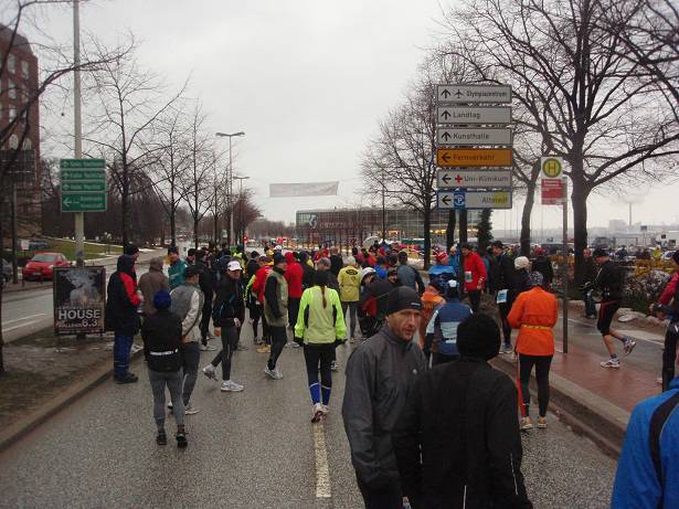 Düsternbrooker Weg 10.04 Uhr So spät wie möglich machte sich die Läuferschar auf den Weg von der Halle an die Startlinie. Noch immer war es sehr windig und kalt und es regnete weiter, wenn auch nicht mehr ganz so stark. |