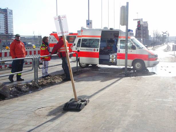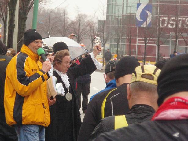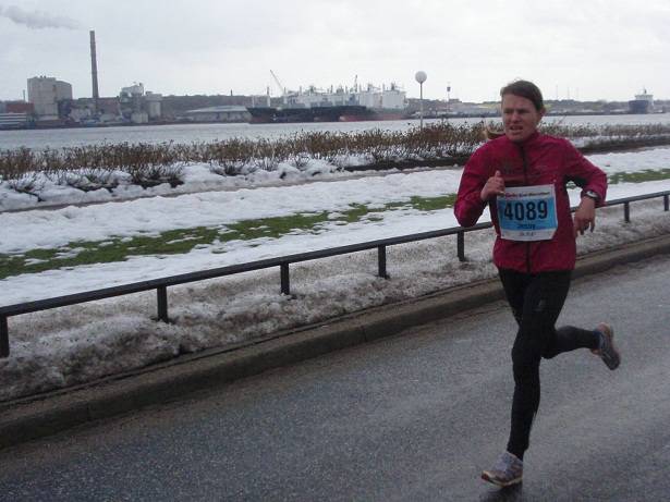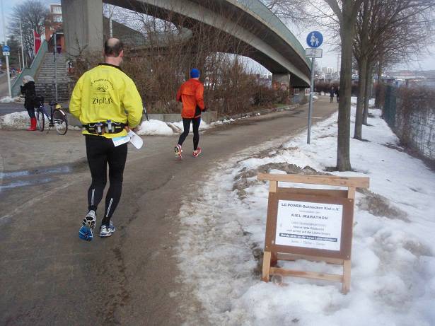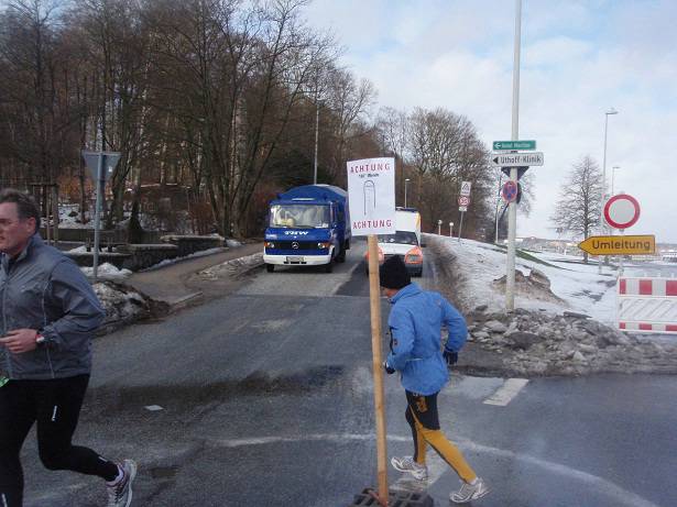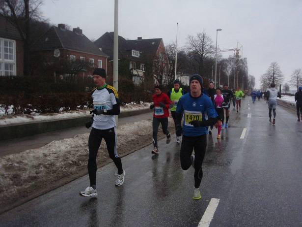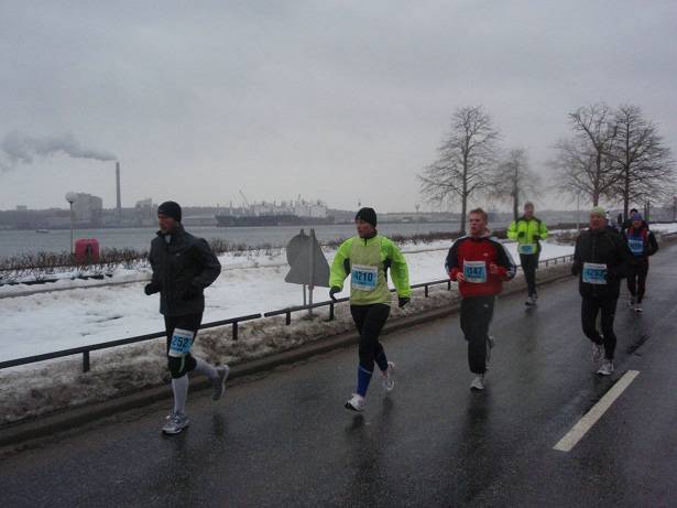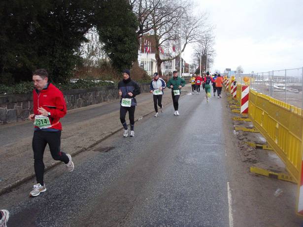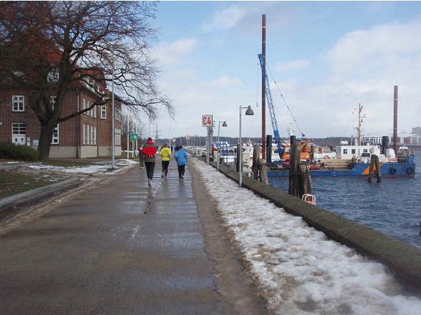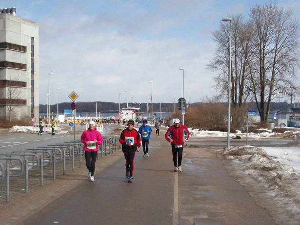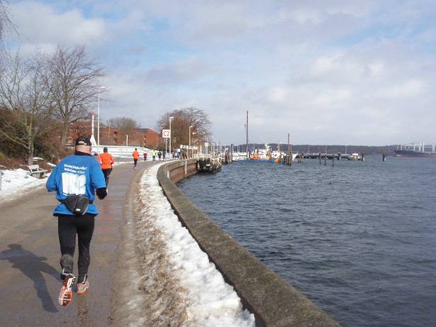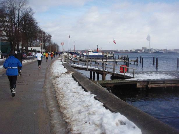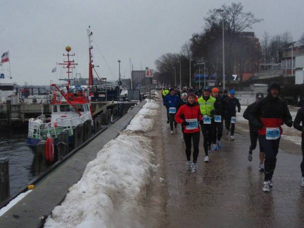 Ostseekai 8.59 Uhr Auf Grund des langen und strengen Winters war eine Änderung der Strecke nötig. Der nördliche Teil entlang des Hindenburgufers war nicht belaufbar, da der Frost endlos Schlaglöcher in den Asphalt gerissen hatte. Nun lief man statt 4x 10,5 Km eben 6x 7 Km. |