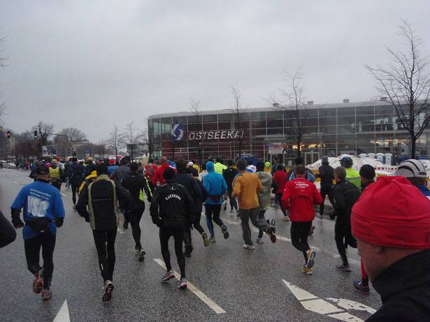 Düsternbrooker Weg 10.10 Uhr / Kilometer 0,1 Runde 1 Gleich zu Beginn ging es am Ostseekai vorbei. Offiziell gab es nun sechsmal sieben Kilometer zu laufen plus dieses Anfangsstück. Aber da komme ich später drauf zurück. |