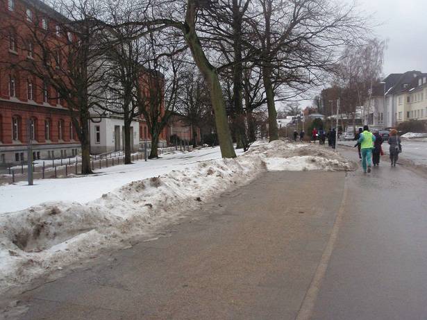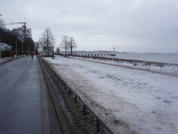 Hindenburgufer 12.09 Uhr / Kilometer 23,0 Runde 4 Auch auf dem letzte Stück vor der nördlichen Wende hatte der Winter Spuren hinterlassen. Es war nur noch eine Fahrbahn frei. Es reichte aber aus. |