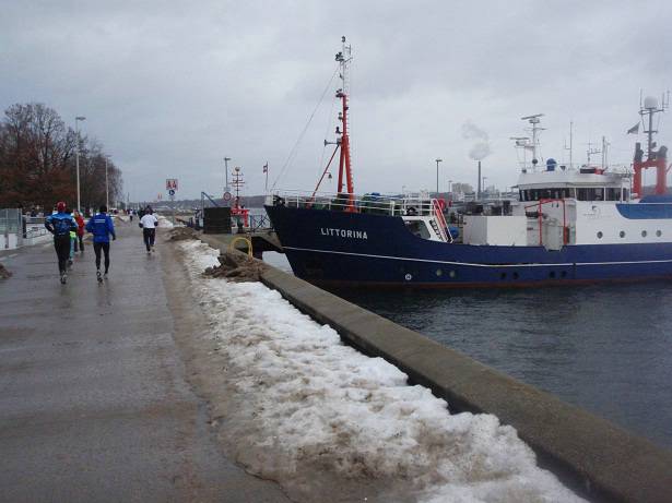 Kiellinie 10.14 Uhr / Kilometer 1,0 Runde 1 Kurz hinter dem Ostseekai ging es ans Wasser. Gab zwar eh schon genug davon von oben, aber auf dem hier gab es immerhin ein paar Schiffe zu bewundern.