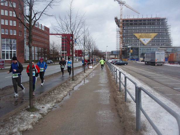 Kaistraße 13.06 Uhr / Kilometer 34,0 Runde 5 Dieser verfluchte Wind. Ich hatte zeitweise das Gefühl, ich würde auf der Stelle laufen. Aber irgendwie ging es doch voran, auch wenn der Weg sich mehr und mehr in die Länge zu ziehen schien. Das Hochhaus markiert fast den südlichen Wendepunkt. |