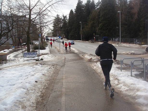 Kailinie 12.03 Uhr / Kilometer 22,0 Runde 4 Den Halbmarathon hatte ich nach 1:51:05 Std geschafft. Runde 3 also in 35:50 Min. Und ich fühlte mich noch gut. Erstmals nach zwei Monaten lief ich statt in Winterhose wieder in "normaler" langer Laufhose, wenn auch weiter mit Windbreakerunterhose. |