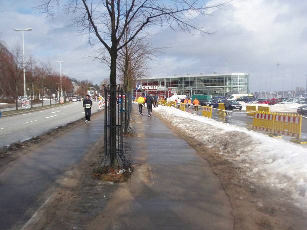 Düsternbrooker Weg 13.12 Uhr / Kilometer 35,0 Runde 5 Noch einmal am Ostseekai vorbei. Nach der nächsten Runde dürfte ich dann rechts über den Parkplatz ins Ziel laufen. |