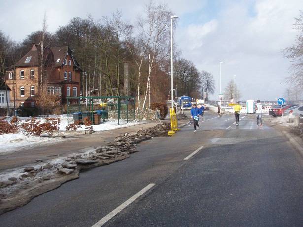 Düsternbrooker Weg 12.57 Uhr / Kilometer 32,0 Runde 5 Am Aquarium ging es kurz bergab, dann folgte schon der nächste Anstieg. Ich hoffe nur, 2011 laufen wir wieder alle flach die Kiellinie auch zurück. |
