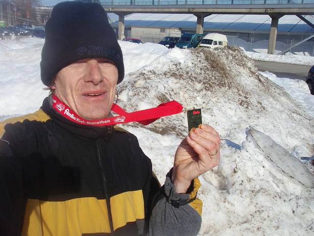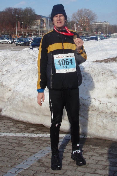 Ostseekai 13.53 Uhr / Kilometer 42,195 Finish Im Gegensatz zu 2009 gab es in Kiel 2010 sogar Medaillen. Und natürlich viel Schnee. 3:42:48 Stunden reichte zu Platz 73 von 203 Finishern (36,0%). Bei den Männern war das Platz 72 von 177 (40,7%) und in der AK M40 Platz 18 von 37 (48,6%). |