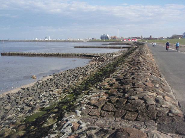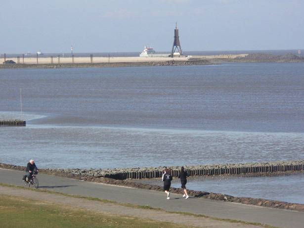 Grimmershörnbucht, 11.15 Uhr Runde 1 / Kilometer 3,0 Wir konnten froh sein, daß es schon Flut war. Noch ein wenig höher und das Wasser hätte auf dem Laufweg gestanden. Schon so kam mehr als genug Wasser auf die Strecke. Und die Gischt fegte uns um die Ohren und die Beine. |