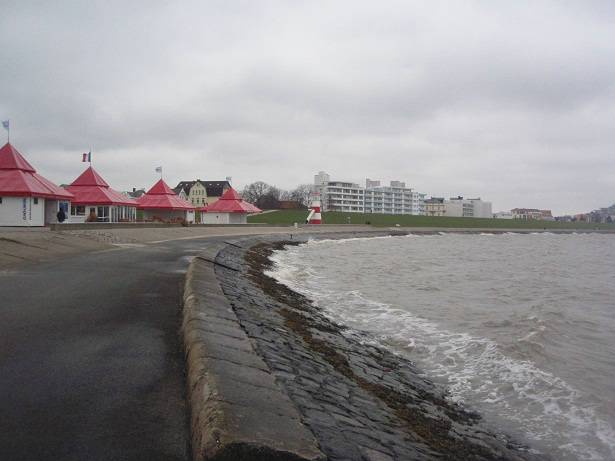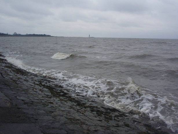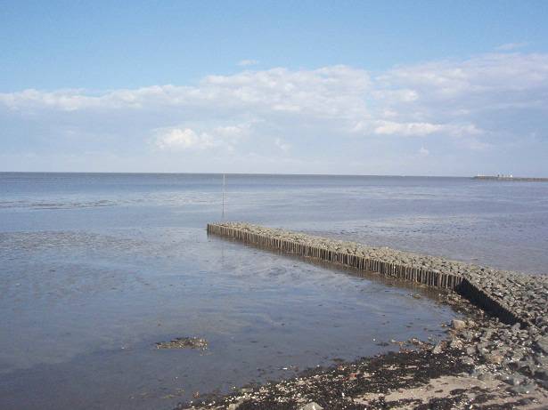 Cuxhaven, 16.42 Uhr Die Grimmershörnbucht mit der Kugelbake grüßte mit scheinbar bestem Wetter. |