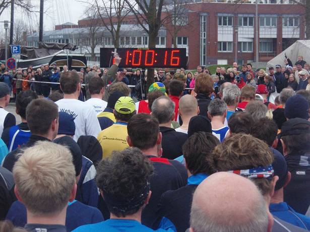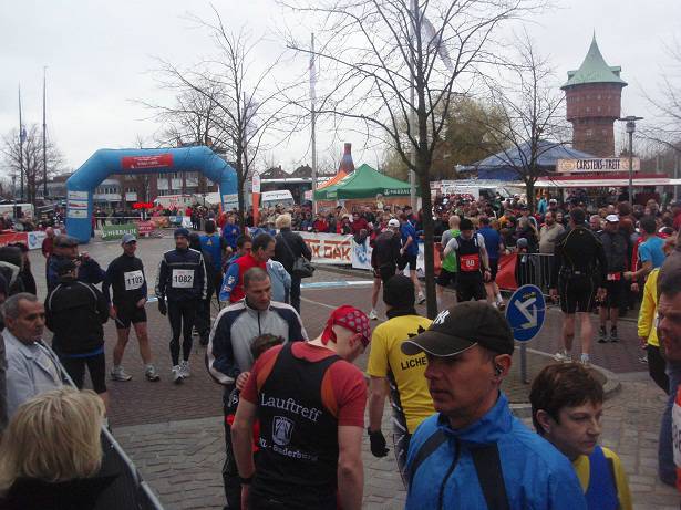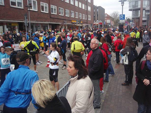 Kaemmererplatz, 10.54 Uhr 520 Läufer (davon 119 für den Marathon, 401 für den Halbmarathon) kamen zu 11 Uhr an den Start. Die 10 Km (337 Läufer), die 3 Seemeilen (37 Läufer) und zwei Kinder-läufe (146 Läufer) starteten gesondert. Machte 1040 Sportler insgesamt. |