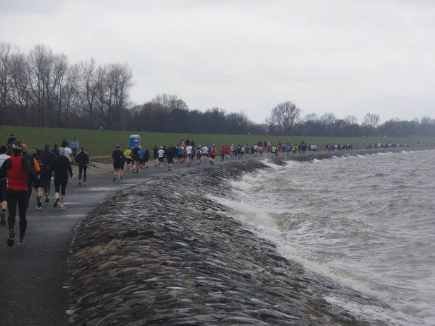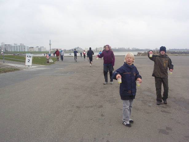 Grimmershörnbucht, 13.00 Uhr Runde 3 / Kilometer 23,5 Nachdem die Halbmarathon-läufer raus waren, blieben noch 119 Marathonläufer auf der Strecke. Davon sah ich hier nicht einen einzigen. Und zum dritten Male ging es gegen den Wind an. Wenn ich einen solchen K(r)ampf erwartet hätte, wäre auf meinem mp3-Player weniger Grimm's Märchen gewesen. Aber die lenkten auch ganz gut ab, waren im Sturm aber kaum zu hören. |