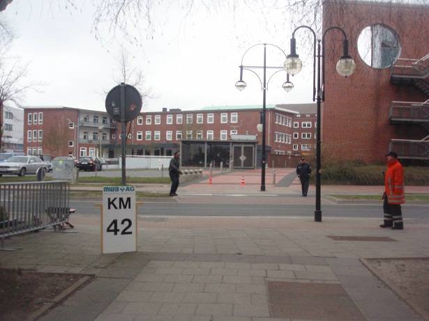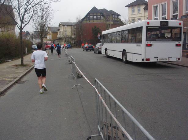 Strichweg, 11.44 Uhr Runde 1 / Kilometer 8,5 Die letzten beiden Kilometer des Kurses ging es dann durch die Stadt. Da mußte sogar der Bus warten. |
