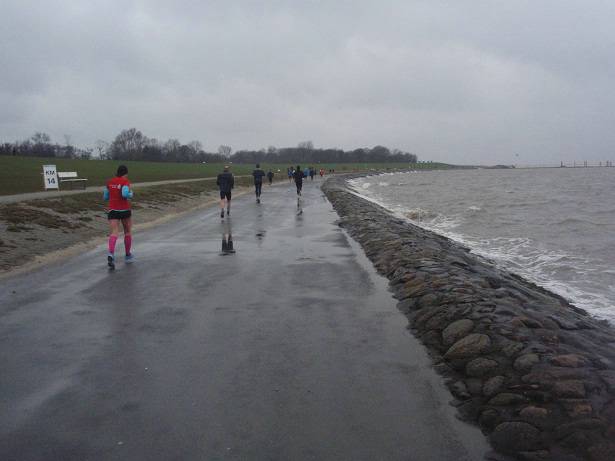 Grimmershörnbucht, 11.20 Uhr Runde 1 / Kilometer 4,0 Zwei Kilometer ging es hier hart gegen den Wind. Es war wie gegen eine Wand laufen. Und die Probleme in Runde 1 ließen für Runde 3 und 4 schlimmes befürchten. |