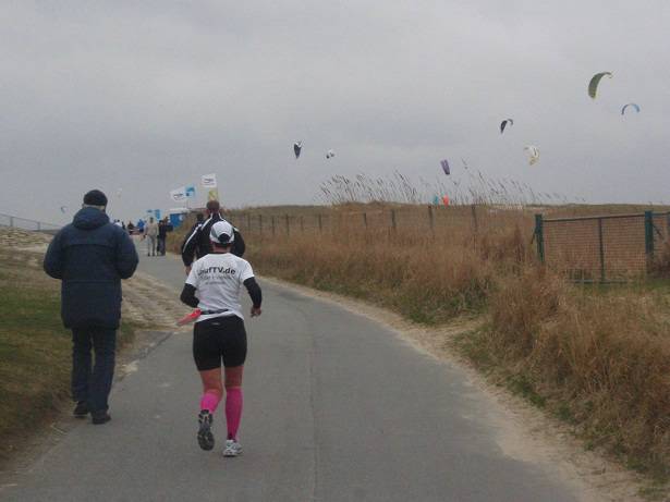 Stramdwanderweg, 12.16 Uhr Runde 2 / Kilometer 15,0 Die da vorne hinter dem Hügel am Strand machten es richtig und ließen Drachen steigen. Dafür war das Wetter ideal. Zum Laufen eher nicht ganz so. |