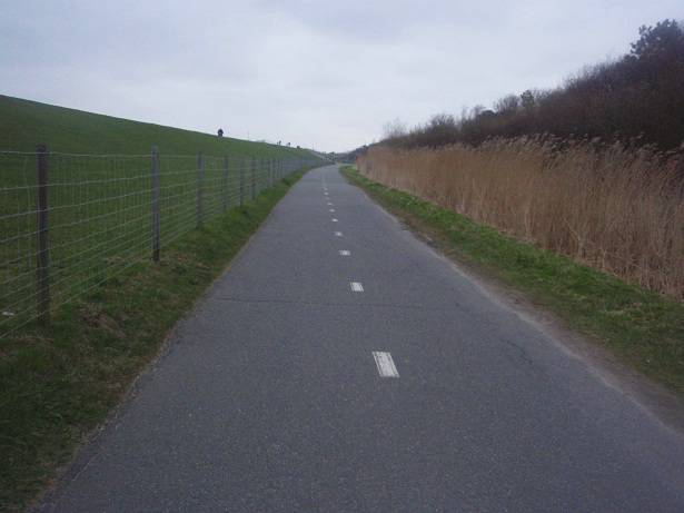 Steinmarner Seedeich, 11.28 Uhr Runde 1 / Kilometer 5,5 Und dann über den Deich rüber zurück gegen den Wind. Diese Deichquerung ist die einzig nennenswerte Steigung des Kurses, der sonst praktisch flach ist. |