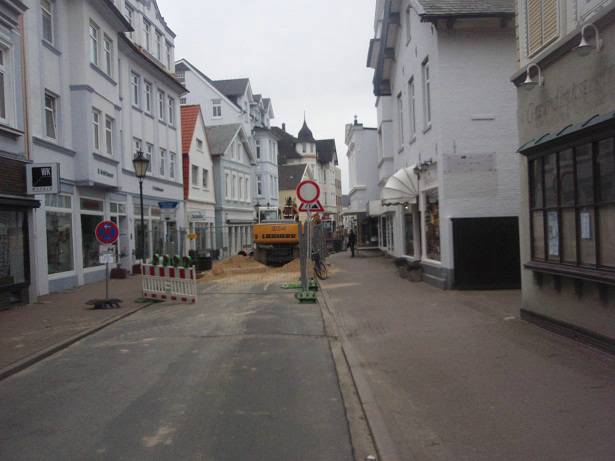 Schillerstraße, 13.38 Uhr Runde 3 / Kilometer 30,5 Und auch in Cuxhaven wird fleißig an den Frostschäden gearbeitet. Hier ging es für uns Läufer rechts an der Baustelle vorbei. Da durfte dann aber auch keine von vorne entgegenkommen. |