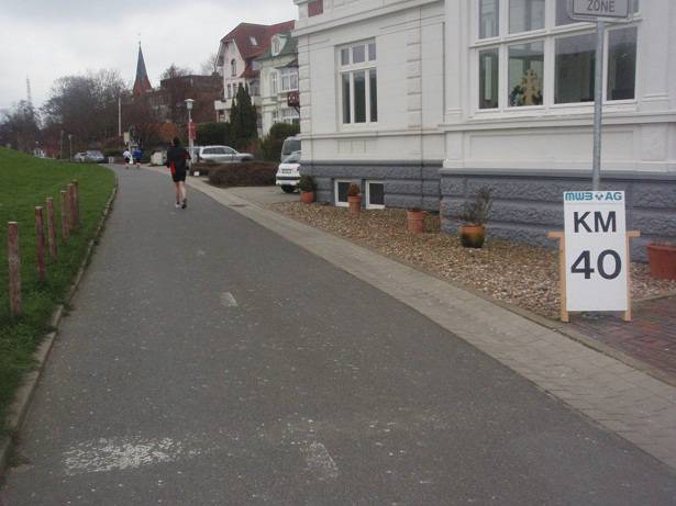 Döser Seedeich, 14.30 Uhr Runde 4 / Kilometer 40,0 So wirklich stand das Schild hier nicht richtig, aber egal. Hauptsache es ging dem Ziel entgegen. Und tatsächlich gab es auch mal einen anderen Läufer in meinem Blickfeld. So waren es "nur" 54:45 Minuten für die Km 30 bis 40, aber fast 14 Minuten bis ins Ziel. |