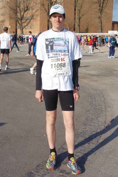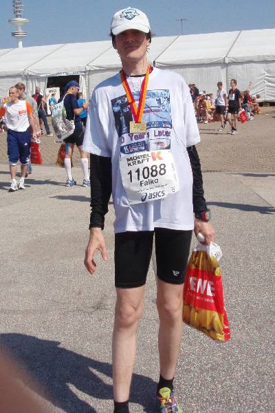 Hamburg geht da einfach vor. Es war gleichzeitig mein 10. gefinishter Marathon in Hamburg. 1990 bei meinem ersten Start war bei Kilometer 20 Schluß. Danach dauerte es bis zum 16.04.2000, ehe ich wieder an den Start ging. Dort kam ich nach 5:17:34 Stunden ins Ziel. 2001 schaute ich nur zu, seit 2002 bin ich jedes Jahr dabei und bin auch jedes Mal erfolgreich ins Ziel gekommen. Der erste Hamburg-Marathon war übrigens am 25. Mai 1986. Das Werbeschild "25 Jahre Marathon Hamburg" stimmt also so nicht ganz. Am Lauftag waren es "nur" 23 Jahre und 11 Monate. |