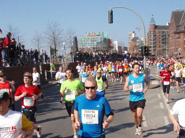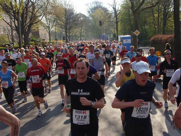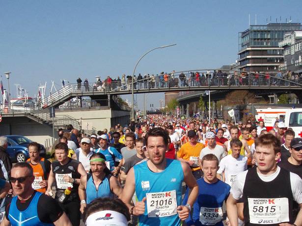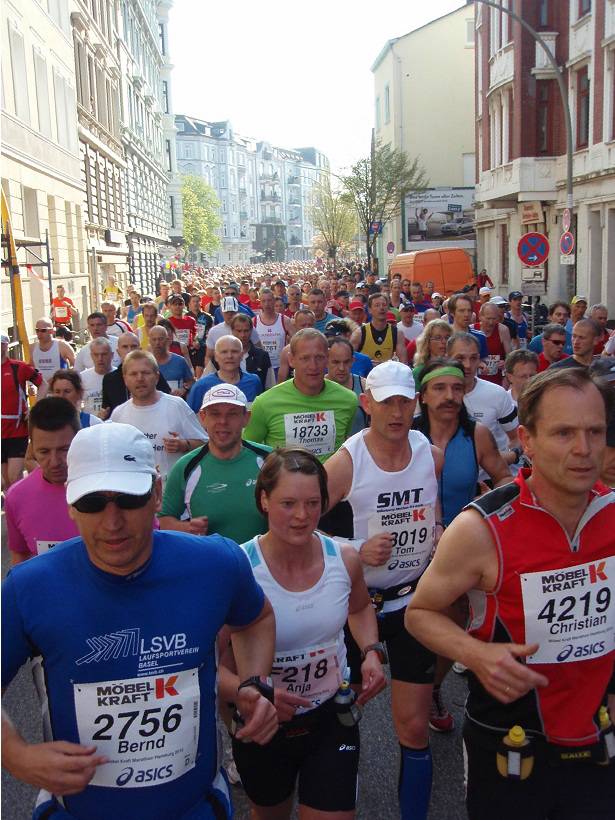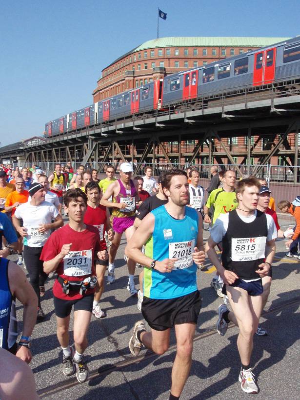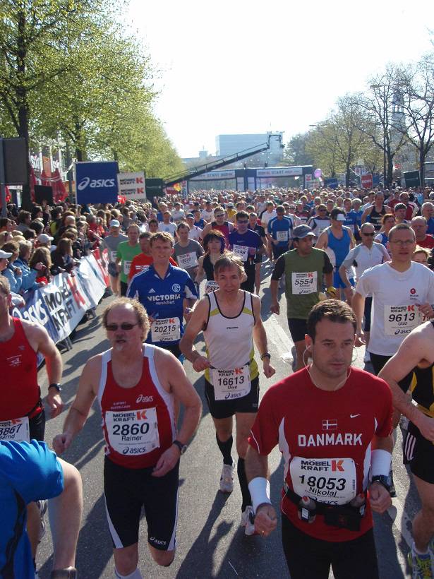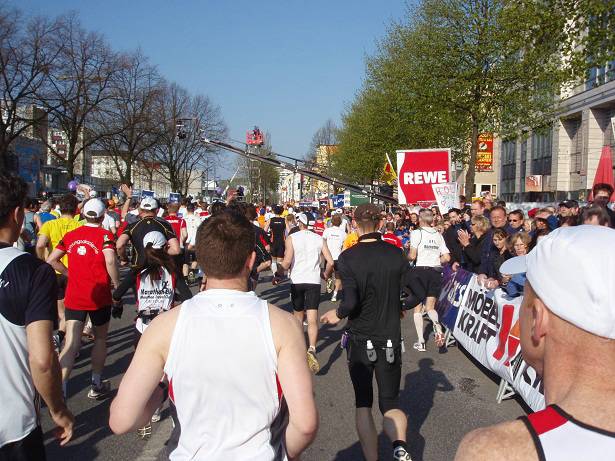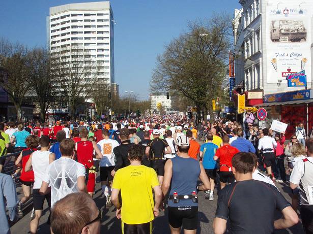 Reeperbahn 9.01 Uhr / Kilometer 0,1 Gleich zu Beginn Hamburgs wohl bekannteste Straße. Viel zu sehen bekam man aber nicht, dafür standen zum Einen zu viele Menschen am Rand und zum Anderen war es so eng auf Straße, daß man dort genug aufpassen mußte. |