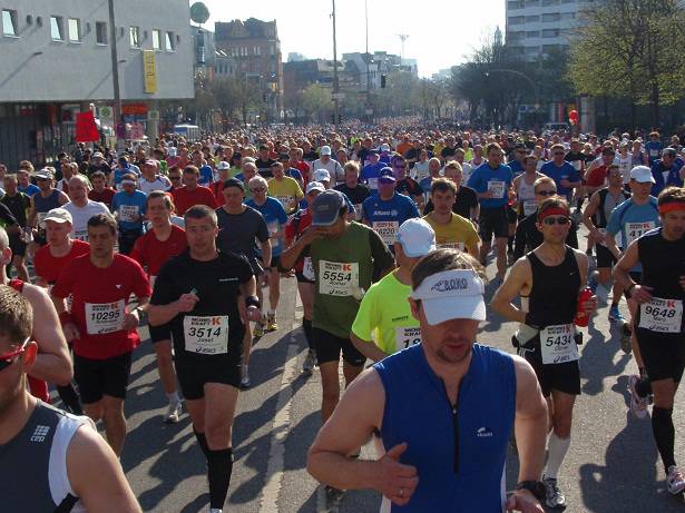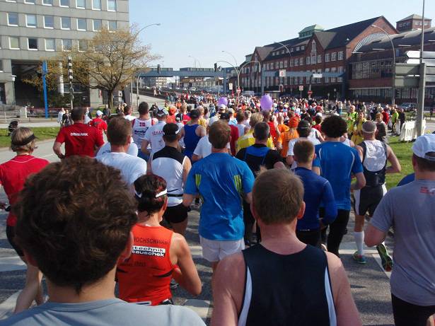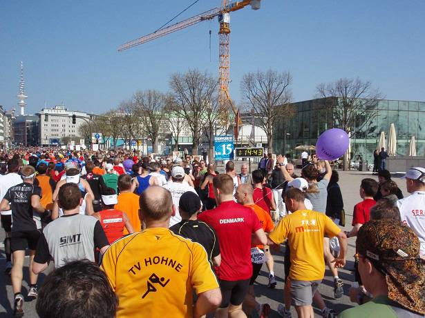 Millerntorplatz 9.00 Uhr / Kilometer 0,0 Kaum ist der Start frei, rollte die Welle von 15147 Läufern los. Nach nur 90 Sekunden hatte auch ich den Start erreicht. |